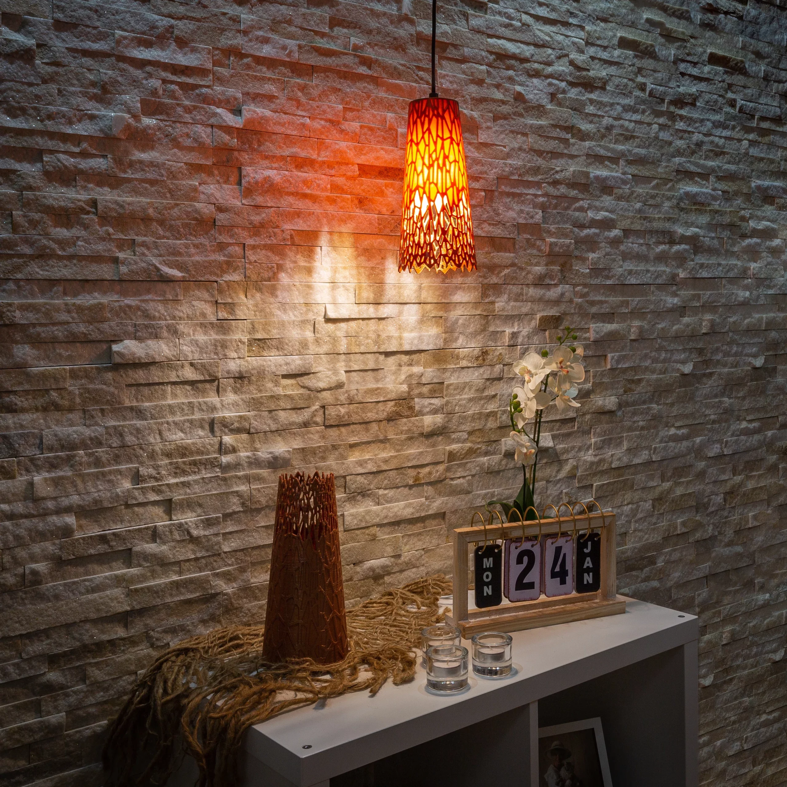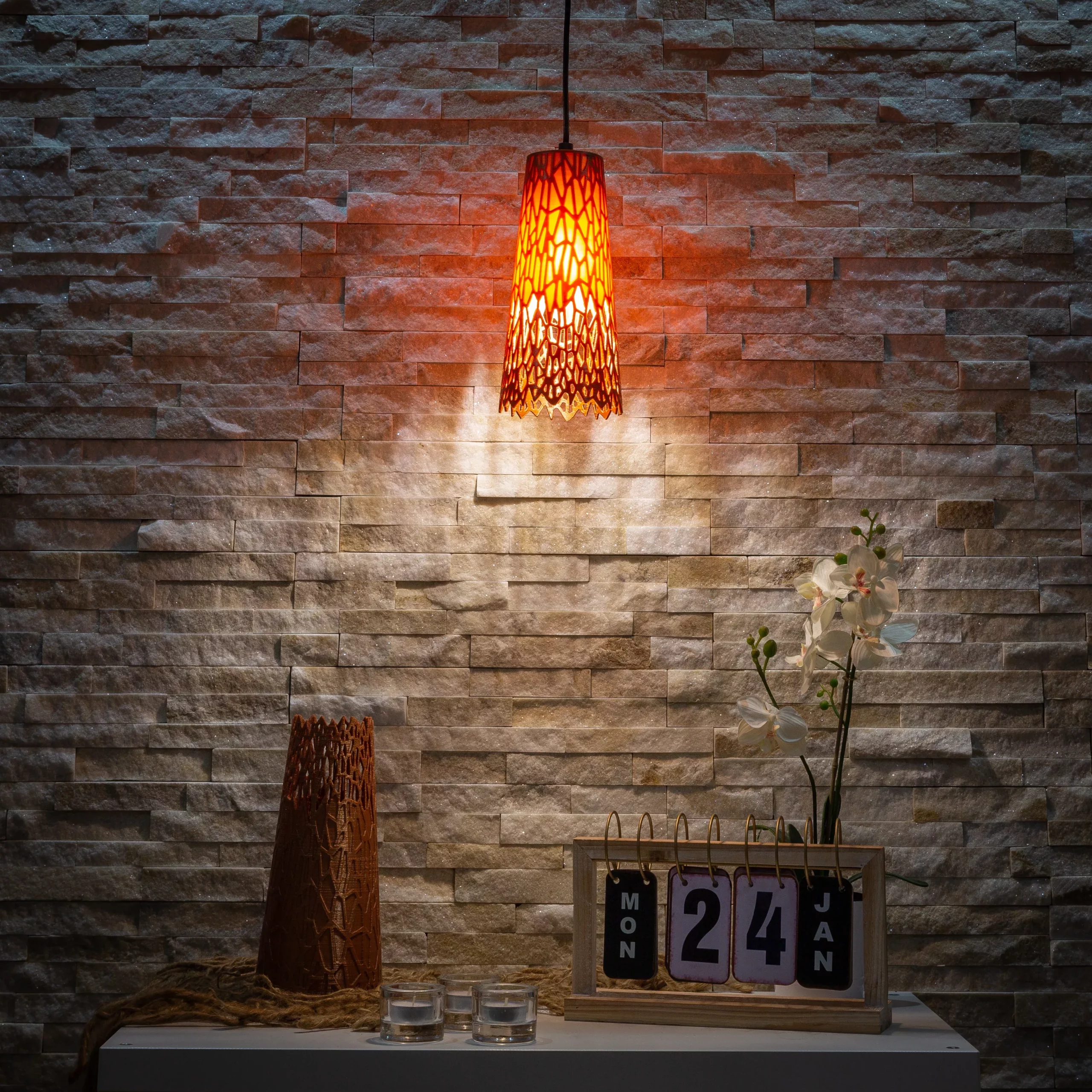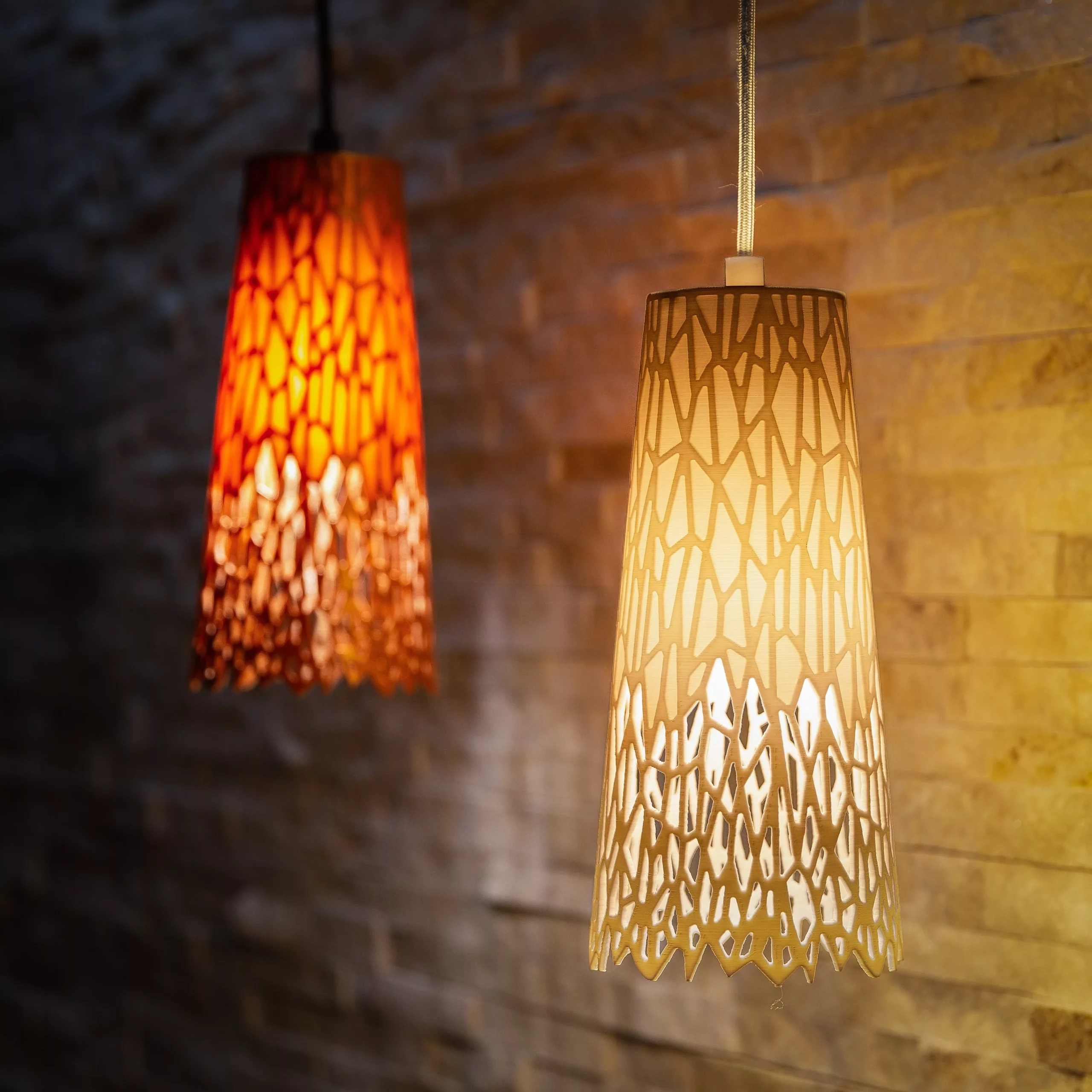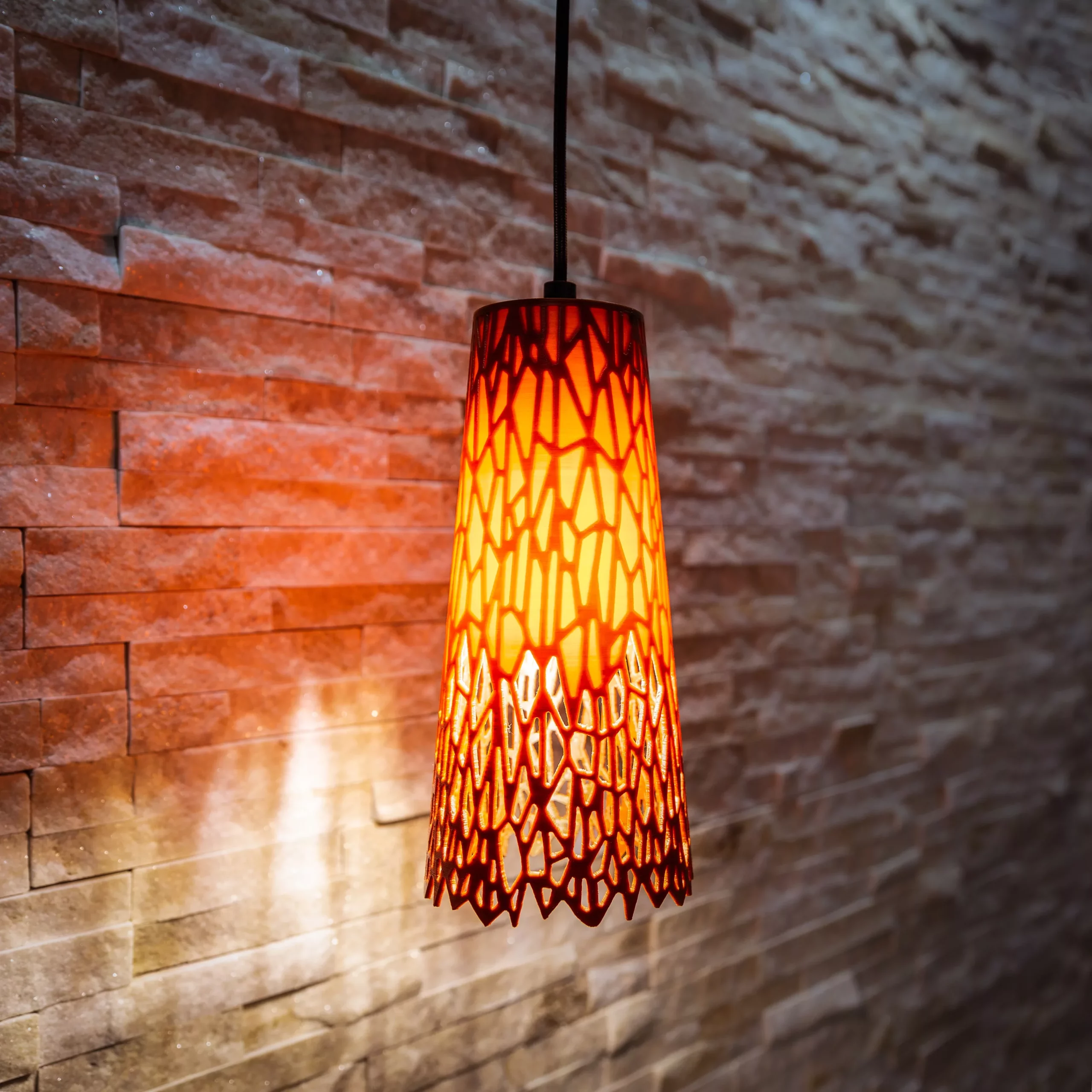 Una forma primitiva, un tronco di cono, una “maglia corallina”. Dall’antitesi di questi due elementi nasce la lampada della linea Coral.